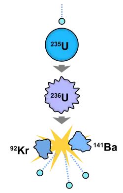 Появление 2,5 нейтрона на акт деления позволяет осуществить цепную реакцию, если из этих 2,5 нейтрона как минимум один сможет произвести новое деление ядра урана. Обычно испускаемые нейтроны не делят ядра урана сразу же, но сначала должны быть замедлены до тепловых скоростей (2200 м/с при T=300 K). Замедление достигается наиболее эффективно с помощью окружающих атомов другого элемента с малым A, например водорода, углерода и т. п. материала, называемого замедлителем.
