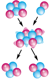 • Если вещество нагревается до чрезвычайно высоких температур в звезде или термоядерном реакторе. Согласно кинетической теории, кинетическую энергию движущихся микрочастиц вещества (атомов, молекул или ионов) можно представить в виде температуры, а, следовательно, нагревая вещество, можно достичь ядерной реакции синтеза. В таком случае говорят о термоядерном синтезе или термоядерной реакции (см. ниже).