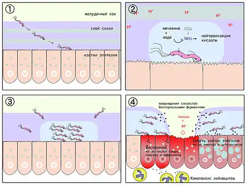 К факторам 2-й группы относятся: желудочный сок (содержащий соляную кислоту и пепсин — фермент, осуществляющий переваривание белковых соединений), являющийся агрессивным агентом для клеток, и инфекционный фактор — микроб Хеликобактер — Helicobacter pylori (в случае инфицирования им). Возникновение язвенного дефекта происходит, когда разрушительное действие на слизистую желудка агрессивных факторов начинает преобладать над действием защитных факторов. Заметное количество язвенных поражений желудка связаны с инфицированием микроорганизмом Helicobacter pylori, спиралевидной ацидофильной бактерией, живущей в кислом содержимом желудка и в его слизистой оболочке. Однако лишь небольшое число инфицированных носителей Helicobacter pylori заболевают клинически выраженной язвенной болезнью желудка или двенадцатиперстной кишки либо гастритом с повышенной кислотностью. Причины того, что заболевает меньшая часть инфицированных этим микроорганизмом, не ясны: по-видимому, имеет значение состояние общего и местного иммунитета, неспецифические защитные факторы слизистой желудка (секреция бикарбонатов, защитной слизи), исходная (до заражения) кислотность и ферментативная активность желудочного содержимого и т. д.