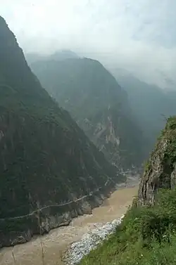 Исток Янцзы расположен к западу от горы Геладандун Тангла, в восточной части Тибетского нагорья на высоте около 5600 м над уровнем моря. Река, в своём верхнем течении известная как Цзиньшацзян[5], протекает через южные области провинции Цинхай, а затем поворачивает к югу и по глубокой долине, достигает провинции Юньнань[17]. В этой долине, расположенной в Сино-Тибетских горах, происходит основной сброс высоты — с 5 тыс. до 1 тыс. м. Здесь река несколько раз меняет направление и образует глубокие ущелья, такие как Ущелье Прыгающего Тигра.