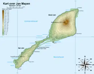 Остров Ян-Майен — вулканического происхождения, частично покрытый ледниками (площадь оледенения — 117 км²) и разделённый на бо́льшую северную часть (нор. Nord-Jan) и меньшую южную (нор. Sør-Jan), которые соединяются перешейком шириной примерно в 2,5 километра.