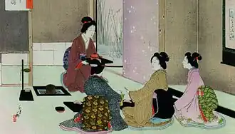 Перед церемонией гости собираются вместе в одной комнате. Здесь им подаётся горячая вода в небольших чашках. Назначение этого этапа — создать у гостей общее настроение, связанное с ожиданием предстоящей церемонии как важного и приятного действия, встречи с прекрасным.