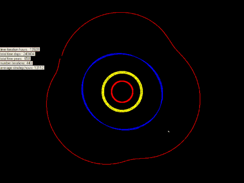Либрации резонанса 3:4 (15836) 1995 DA2. Нептун (орбита выделена белым) стационарные точки в 5 часов. Орбиты: Урана — синяя, Сатурна — жёлтая и Юпитера — красная.