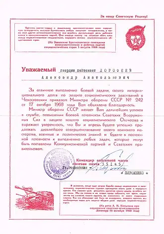 Приказом Министра обороны СССР от 17 октября 1968 года № 242 за образцовое выполнение задания командования и интернационального долга по оказанию помощи трудящимся Чехословакии в борьбе с контрреволюционными элементами и проявленные при этом отвагу и мужество всему личному составу дивизии, участникам операции «Дунай» объявлена благодарность.