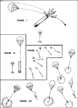 Боеприпас имел весьма хитроумную конструкцию. Миномётный снаряд имел начины которая состояла из 7 небольших (17×127 мм) зарядов взрывчатого вещества с прикрепленными к ним парашютами. Каждый примерно 11/16 дюйма в диаметре (18 мм) и 3 дюйма (76 мм) в длину. После выстрела мина поднималалась на высоту около 600 метров и, достигнув верхней точки траектории полета, «воздушные мины» выпали из нее и медленно падали вниз с парашютами. Они были сделаны так, чтобы взорваться при контакте самолета со шнуром или через определенный период времени, повредив ближайший самолет. Теория применения предполагала, что если длина шнура суббоеприпаса составляла 1 м, то площадь поражения самолета (например Curtiss P40) была предположена равной 18 м 2 . При расстоянии между парашютируемыми боеприпасами примерно 25 метров (по вертикали и горизонтали) вероятность поражения рассчитывалась как 3 %. Если предположить, что выпущено несколько мин с тем же разбросом, вероятность попадания возможно составит 15 %, а если таких зон заграждения несколько, то считалось, что вероятность попадания составит около 50 %. Чтобы создать «зенитную батарею», обращенные против ветра минометы вбивались в землю, таким образом, чтобы угол стрельбы учитывал скорость ветра и желаемую высоту заградительной зоны. Типичная «зенитная батарея» имела около 20 минометов, а в минуту производилось около 20 выстрелов на миномет.