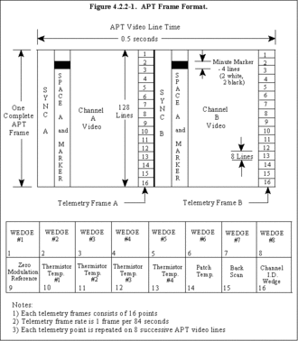 Передача осуществляется построчно. В каждую строку горизонтальной развёртки входят данные двух каналов изображения (обычно обозначаются Video A и Video B), данные телеметрии, специальные последовательности для синхронизации. Длина каждой строки изображения — 2080 пикселей. Каждый канал изображения занимает по 909 пикселей, остаток используется для телеметрии и синхроданных. В секунду передаётся 2 строки, итоговый темп передачи составляет 4160 [бод].