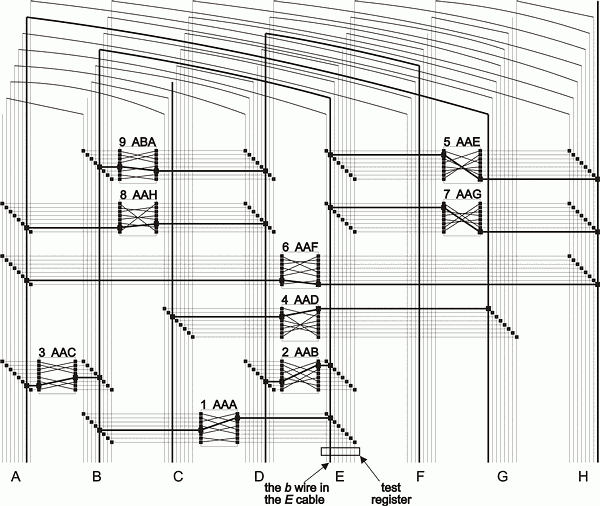 Тестовый регистр подключён к одному из кабелей, соответствующий наиболее часто появляющейся букве в меню. Каждой букве соответствует один провод, который характеризуется двумя состояниями. И в то же время, тестовый регистр способен определять количество проводов, по которым течет ток.
