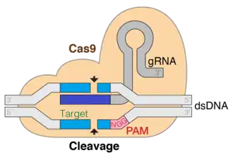 CRISPR/Cas9. Фиолетовым выделен участок гидовой РНК (gRNA) узнающий комплементарный участок-мишень на ДНК (выделен синим). PAM (выделен красным).