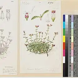 Цветки представлены на коротких цветоножках в малочисленных кистях. Чашелистики острые с реснитчатым краем. Лепестки яйцевидно-ланцетные, острые, с короткой, острой, гладкой мукро ниже вершины, звездчато-раскидистые и гладкие. Пыльники имеют длину 0,25-0,4 мм и представлены от суборбикулярных до почти продолговатых. Листовки длиной примерно 1,5 мм, гладкие, суженные на конце[3].