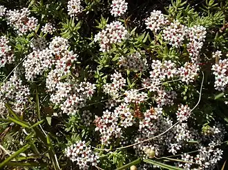 Редко разветвленные травы до 40 см высотой с мочковатыми корнями. Ветви вначале зеленые, диаметром 1—2 мм, с отогнутыми грубыми волосками, позднее покрываются красновато-коричневой корой, которая со временем буреет. Старые листья и волоски стойкие. Листья размером 10–35 x 2–5 мм, восходящие, раскидистые, от линейно-ланцетных до треугольно-ланцетных, уплощенные, от зеленого до серо-зеленого цвета, с прижатыми полупрозрачными стержневидными волосками, острыми на одном конце. Верхняя сторона листа от плоской до вогнутой, слегка выпуклая, нижняя сторона заметно выпуклая, вершина острая[2].