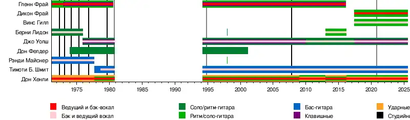 18 января 2016 года скончался основатель группы Гленн Фрай. Причиной смерти стали осложнения, наступившие из-за пневмонии, острого язвенного колита и ревматоидного артрита. 13 марта того же года группа объявила о распаде[7].