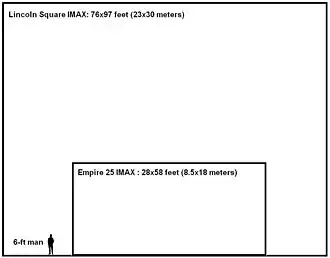 Кинотеатр IMAX с самым большим в мире экраном был расположен в Сиднее (размер экрана 35,72 м × 29,57 м)[59]. 25 сентября 2016 года было принято решение о его закрытии и последующем сносе[60]. К концу 2019 — началу 2020 г.г. на месте старого снесённого здания планируется построить новое, The Ribbon[61][62][63]. Размер экрана в новом здании незначительно уменьшится, однако звание самого большого IMAX экрана в мире экран в Сиднее сохранит[64]. Тем самым на время строительства нового экрана в Сиднее титул самого большого экрана в мире перешёл кинотеатру в Мельбурне (размер экрана 32 м × 23 м) в той же Австралии[65][66]. Крупнейшие в Северной Америке кинотеатры IMAX DOME расположены в Джерси-Сити, США и Ванкувере, Канада[67][68].