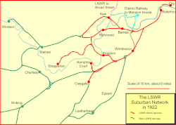 LSWR стала второй британской железнодорожной компанией, запустившей сервис, который можно назвать пригородным сообщением. Её первым проектом такого рода в 1836 году стала Железная дорога Лондон — Гринвич.