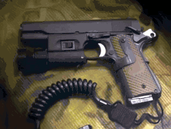 Пистолет MEU(SOC), оснащенный тактическим фонарём SureFire, страховочным ремешком Gemtech и щёчками Strider Gunner