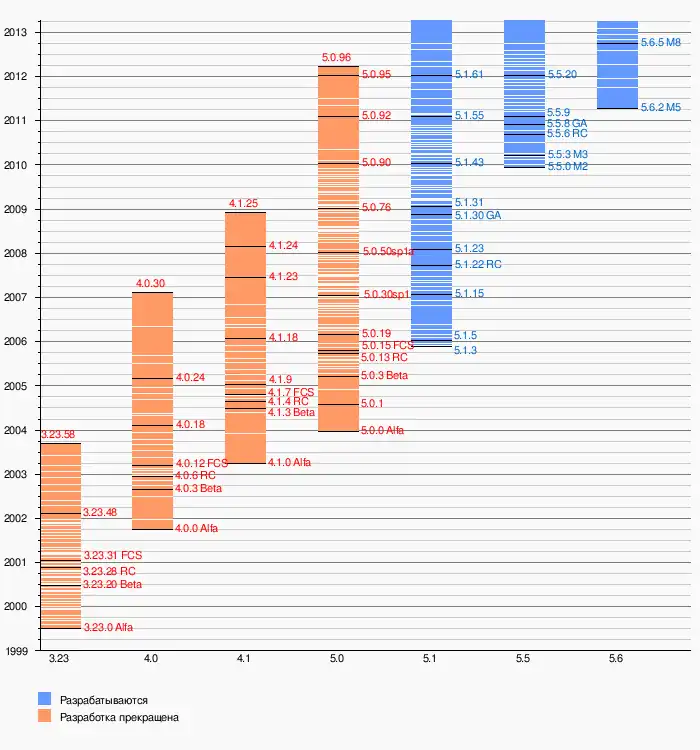 - Версия 5.6: в разработке (последний релиз — 5.6.50 от 19.10.2020).[24]