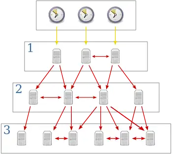 NTP использует иерархическую сеть, где каждый уровень имеет свой номер, называемый слой (англ. stratum). Слой 1 — первичные серверы, непосредственно синхронизирующиеся с национальными службами времени через спутник, радио или телефонный модем. Слой 2 — вторичные серверы, синхронизируются с первичными серверами, и т. д. Как правило, клиенты и серверы NTP с относительно небольшим числом клиентов не синхронизируется с первичными серверами. Существует несколько сотен общественных вторичных серверов, работающих на более высоких слоях. Они являются предпочтительным выбором[7].