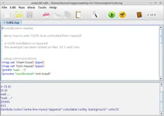 В состав дистрибутива newLISP входит простая среда программирования[3], в которой под областью редактирования исходного текста находится окно эмулятора терминала, где можно видеть результаты выполнения лисп-программы (см. REPL)[4].