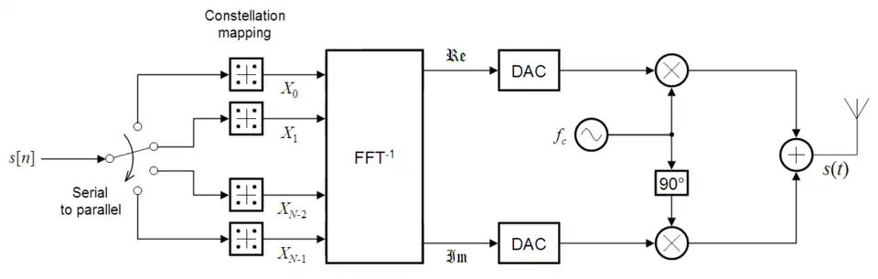 Обратное FFT считается для N одновременно поступающих символов, создавая такое же множество комплексных (двухмерных) отсчетов в развёртке по времени (time-domain samples). Далее ЦАП (DAC) преобразуют в аналоговый вид раздельно ортогональные информационные компоненты, модулирующие, соответственно, несущие косинусоиду и синусоиду. Отмодулированные ортогональные несущие суммируются и дают передаваемый сигнал s(t).