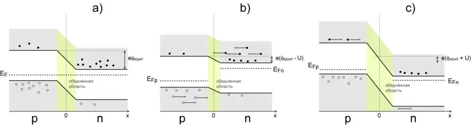 Энергетическая диаграмма p-n-перехода. a) Состояние равновесия; b) При приложенном прямом напряжении; c) При приложенном обратном напряжении.