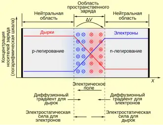 В полупроводнике p-типа, который получается посредством введения акцепторной примеси, концентрация дырок намного превышает концентрацию электронов. В полупроводнике n-типа, который получается посредством донорной примеси, концентрация электронов намного превышает концентрацию дырок. Если между двумя такими полупроводниками установить контакт, то возникнет диффузионный ток — основные носители заряда (электроны и дырки) хаотично перетекают из той области, где их больше, в ту область, где их меньше, и рекомбинируют друг с другом. Как следствие, вблизи границы между областями практически не будет свободных (подвижных) основных носителей заряда, но останутся ионы примесей с некомпенсированными зарядами[1]. Область в полупроводнике p-типа, которая примыкает к границе, получает при этом отрицательный заряд, приносимый электронами, а пограничная область в полупроводнике n-типа получает положительный заряд, приносимый дырками (точнее, теряет уносимый электронами отрицательный заряд).
