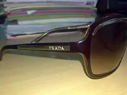 В 2000 году, вместе с компанией Luxottica, Prada выпустил первую коллекцию солнцезащитных очков[18]. Внешний вид очков, как ни странно, не стал приоритетным для Prada. Большое внимание разработчики уделили технологиям оптики и материалам. Очки Prada прекрасно защищают от солнца, и несмотря на свои странные порой формы, они очень удобны в ношении. Используются такие материалы как ацетат целлюлозы, металл, пластик. Визитной карточкой оправ Prada своеобразное сочетание материалов напоминающих змеиную кожу[18]. Особенно популярны их дымчато-кофейные линзы.