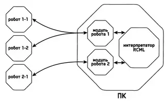 RCML предусматривает работу с группой однотипных роботов и позволяет установить алгоритм выбора наиболее подходящего робота-исполнителя из группы. - Переключение робота между несколькими одновременными задачами.