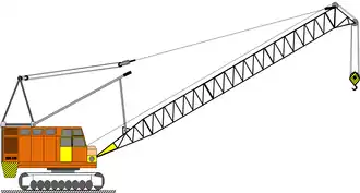 Кран состоит из ходовой и поворотной частей, лебёдки, вращательного механизма, генераторной группы, дизельного генератора, монтажной стойки, кабины управления, опорно-поворотного устройства, основной стрелы и гуська, крюковых обойм.