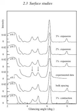 - Определить атомную структуру поверхности путём сравнения зависимостей интенсивности дифракционных рефлексов от угла падения первичного пучка электронов (кривые качания), рассчитанных для структурных моделей, с зависимостями, полученными в эксперименте;