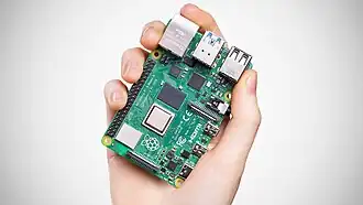 Raspberry Pi (['rɑːzbərɪ paɪ], Ра́збери па́й) — одноплатный компьютер размером с банковскую карту, изначально разработанный как бюджетная система для обучения информатике, но позже получивший более широкое применение и известность. Разрабатывается британской компанией Raspberry Pi Foundation[5][6] во главе с Эбеном Аптоном. По состоянию на конец 2019 года было продано более 30 миллионов устройств Raspberry Pi[2].