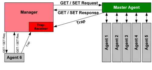 При использовании SNMP один или более административных компьютеров (называемые менеджерами) выполняют отслеживание или управление группой хостов или устройств в компьютерной сети. На каждой управляемой системе есть постоянно запущенная программа, называемая агент, которая через SNMP передаёт информацию менеджеру.