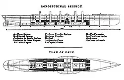 - паровой машины с 4 качающимися цилиндрами диаметром 74 дюйма (1880 мм)[3] мощностью 3650 лошадиных сил (2680 кВт), работающей на гребные колёса, построенной фирмой «Скотт Рассел»;