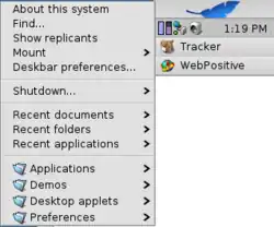 Deskbar представляет собой панель задач, которая по умолчанию располагается в правом верхнем углу экрана в BeOS/Haiku. Она состоит из меню панели задач, трея (информационной панели часов) и списка запущенных программ. Трекер всегда отображается в верхней части списка запущенных программ. Запущенные программы удобно сгруппированы, из Deskbar можно закрыть как отдельное окно, так и все сразу.[2]