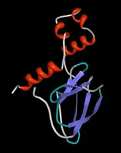 На рисунке представлена идентифицированная ленточная модель белка pVHL, типы конформации полипептидной цепи в разных цветах; спираль — красный, свиток — серый; поворот — зеленоватый; полоса — синий[17].