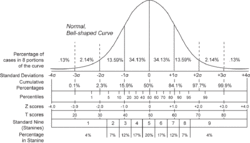 Распространены шкальные оценки, когда оценки результатов теста устанавливаются на основе его места на специальной шкале, которая содержит данные о внутригрупповых нормах выполнения теста. Оценки интеллектуального теста часто преобразуются в шкалу со средним 100 и стандартным отклонением 15 или 16. Значения - показателя[3], вычисленные как имеют широкое применение.